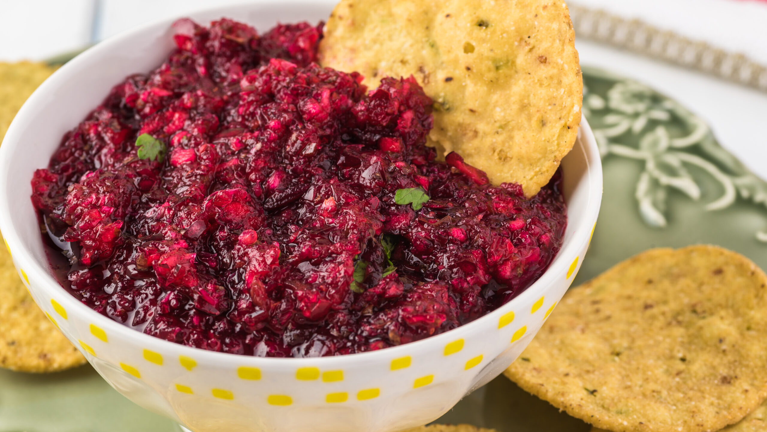 3. When ready to serve, spread or pour the cranberry salsa over chilled cream cheese blocks. Serve with your favorite crackers, pita chips, or crisp bread.